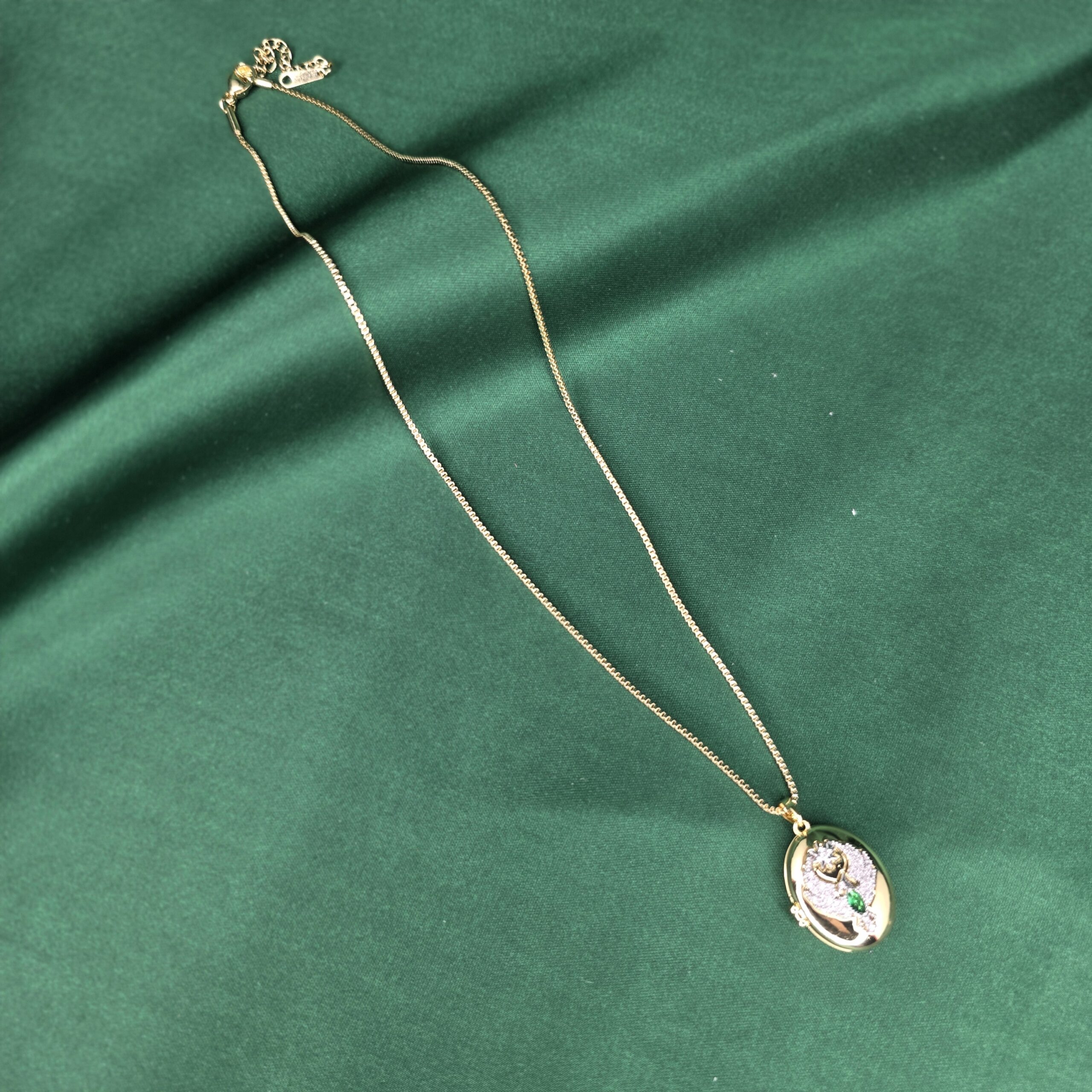 Zarif zinciri ve detaylı işlenmiş oval madalyon ucu ile şıklığınızı tamamlayan özel bir tasarım. Madalyonun ortasındaki yeşil taş, kolyeye hem doğal hem göz alıcı bir dokunuş katıyor. Dilerseniz içine sevdiklerinizin fotoğrafını da koyabilirsiniz.