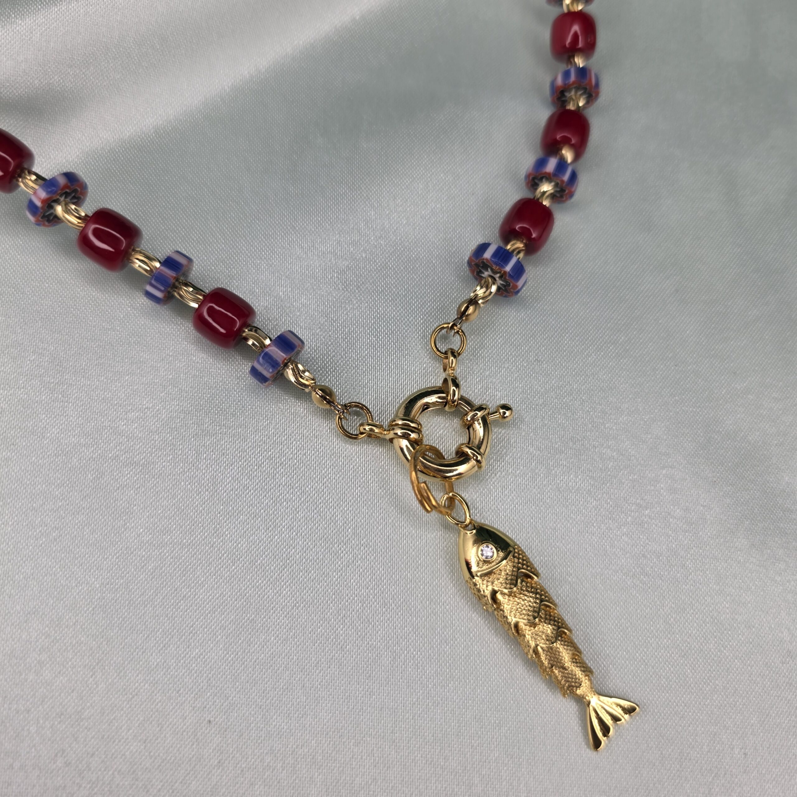 Balık Detaylı Afrika Boncuğu ve Mercan Kolye