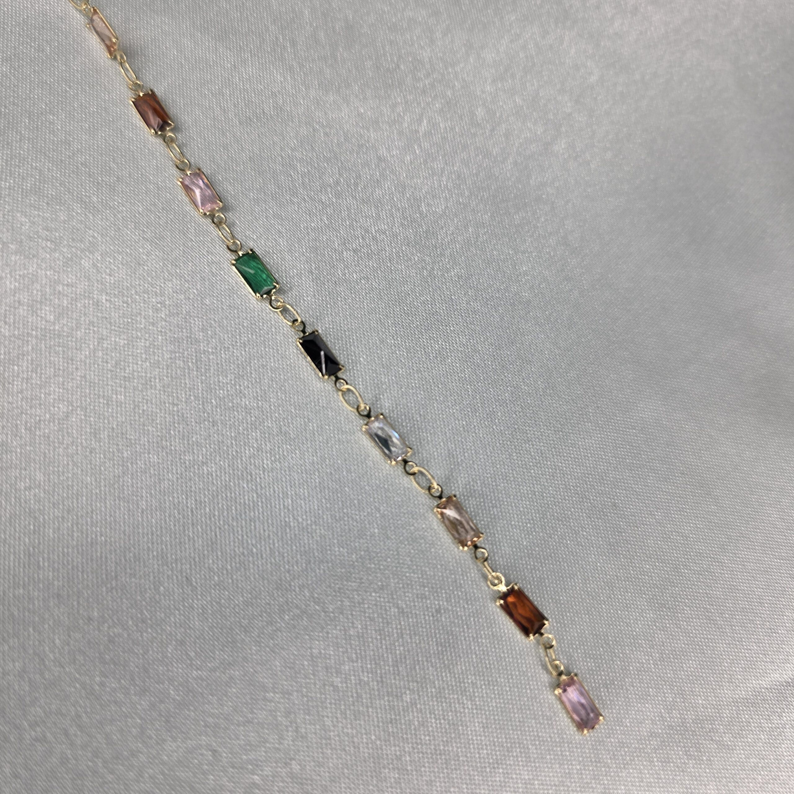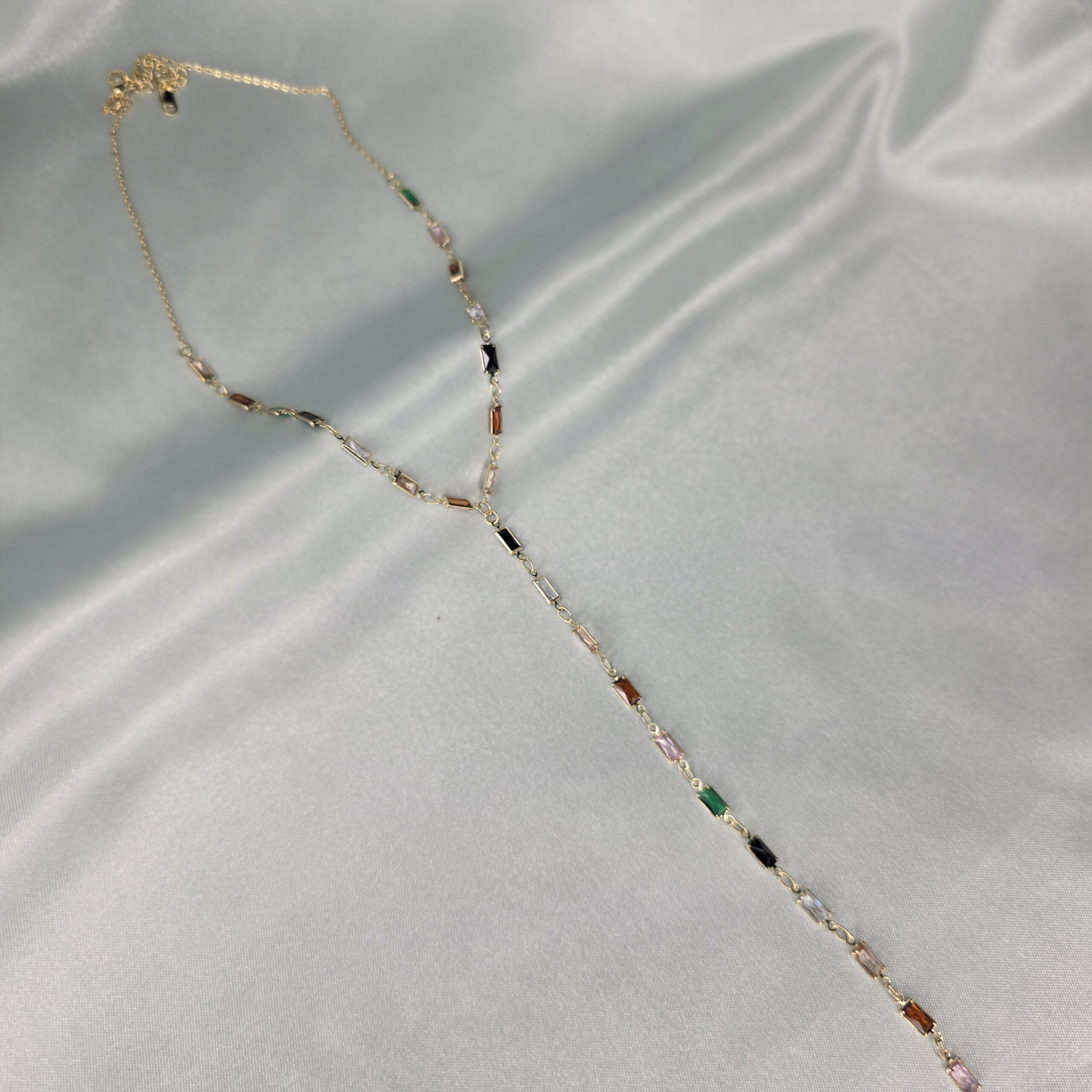 Zarif zincir üzerine tek tek işlenmiş renkli kristal boncuklarla tasarlanan bu kolye, günlük kombinlerinize canlılık ve ışıltı katar.