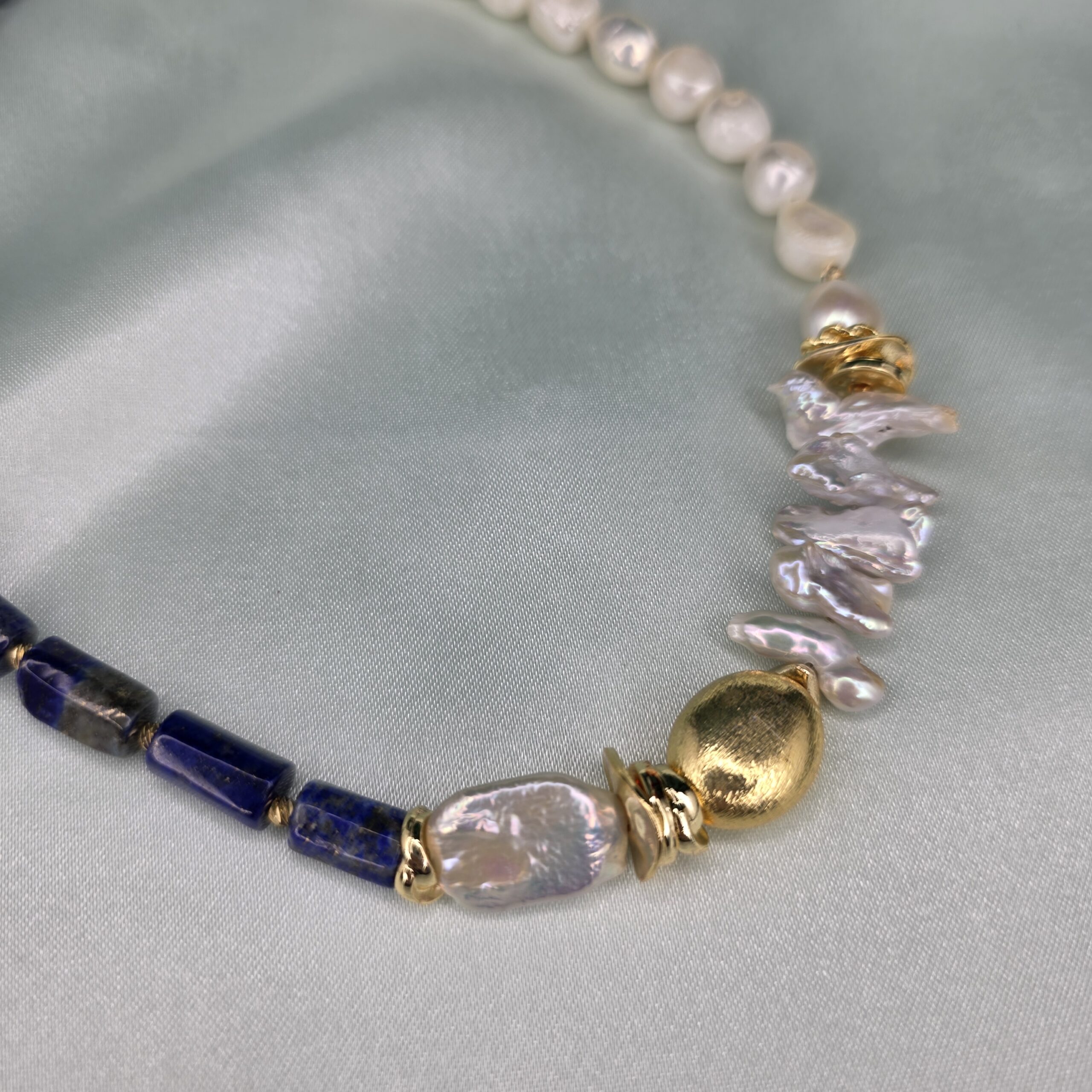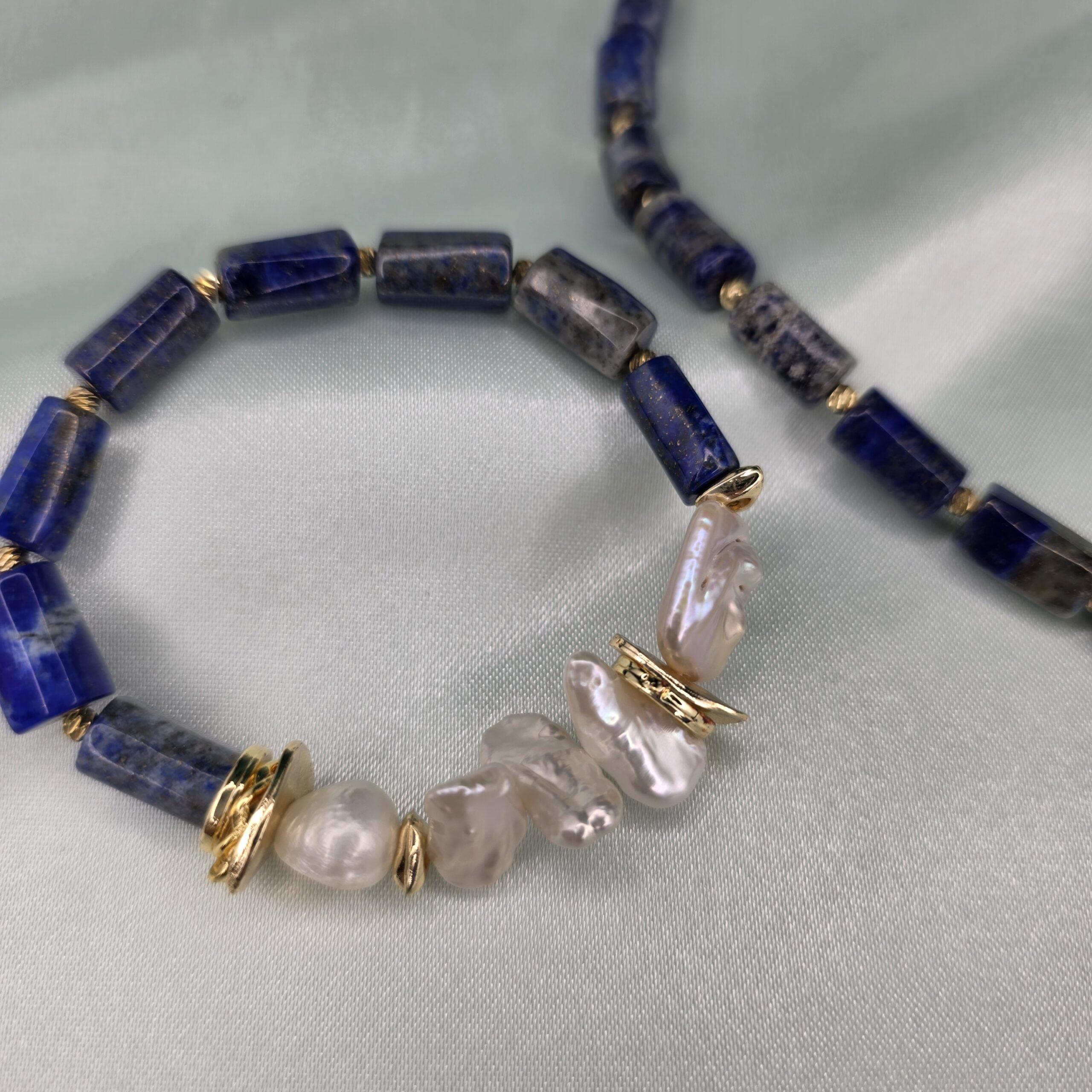 Doğanın gücünü stilinizle buluşturun! Doğal inci ve lapis taşlarından özenle tasarlanmış bu eşsiz takı seti kolye ve bileklikten oluşur.