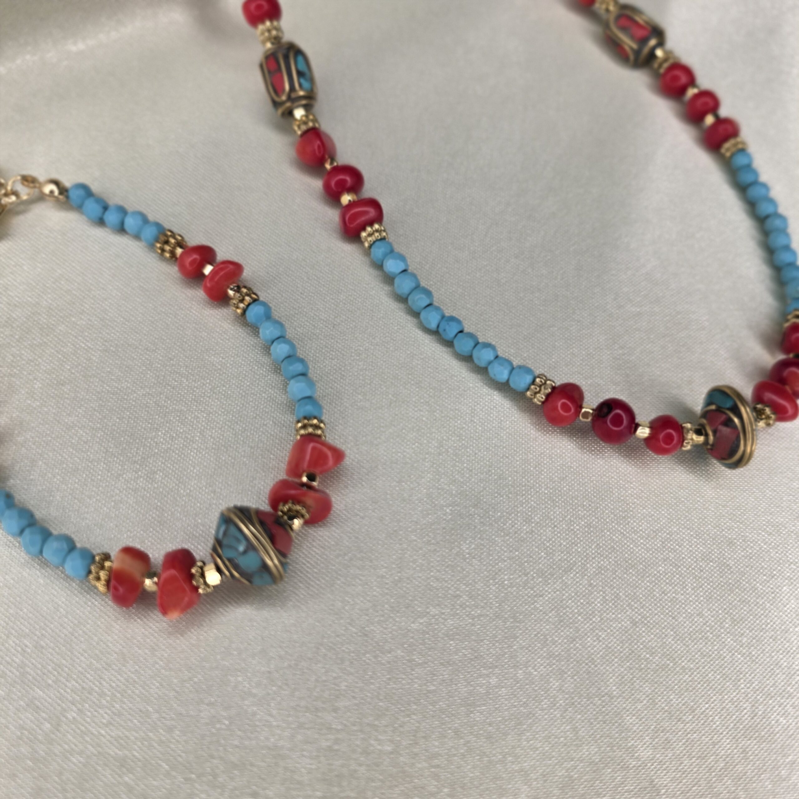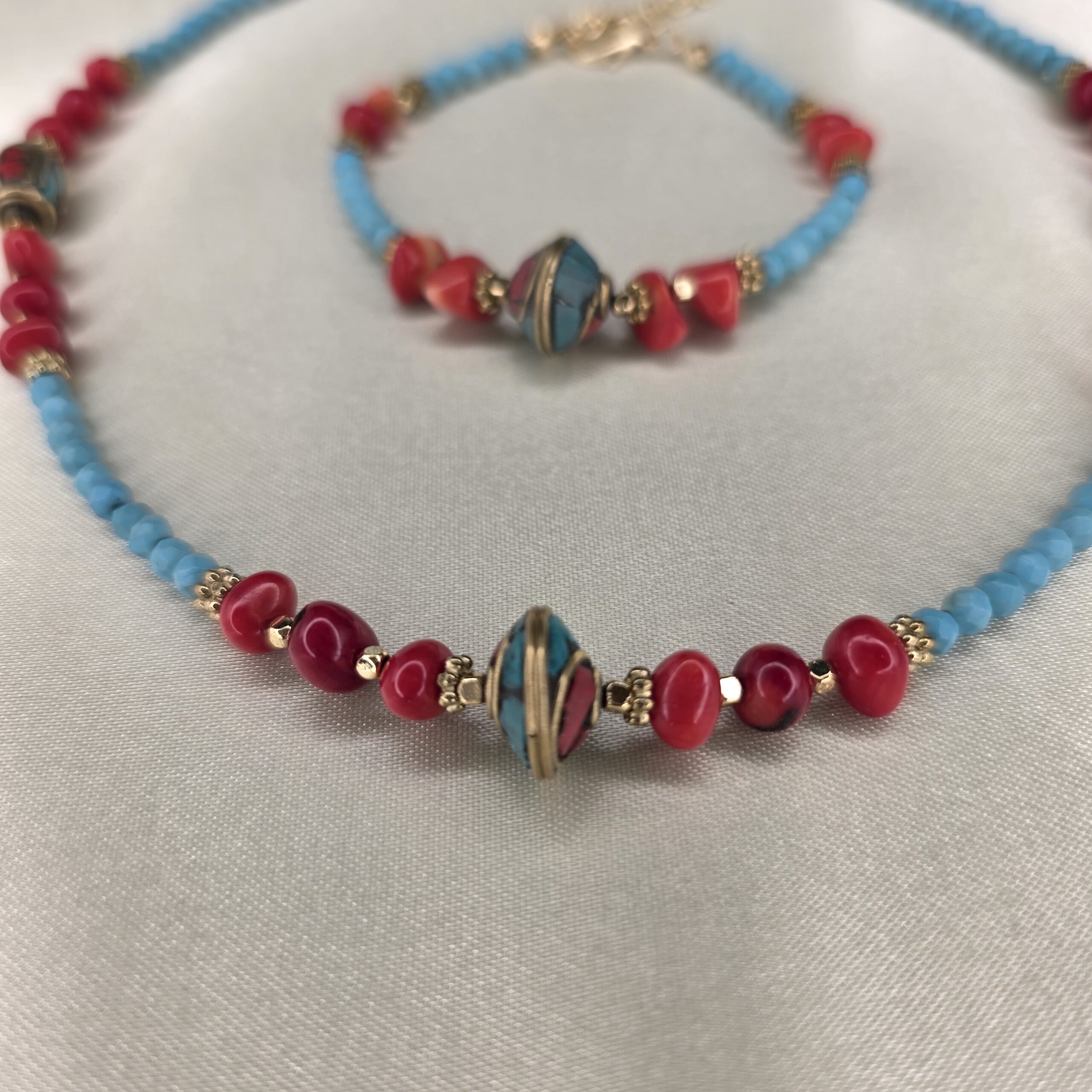 Doğanın gücünü stilinizle buluşturun! Doğal Mercan ve Turkuaz taşından özenle tasarlanmış bu eşsiz takı seti kolye ve bileklikten oluşur.