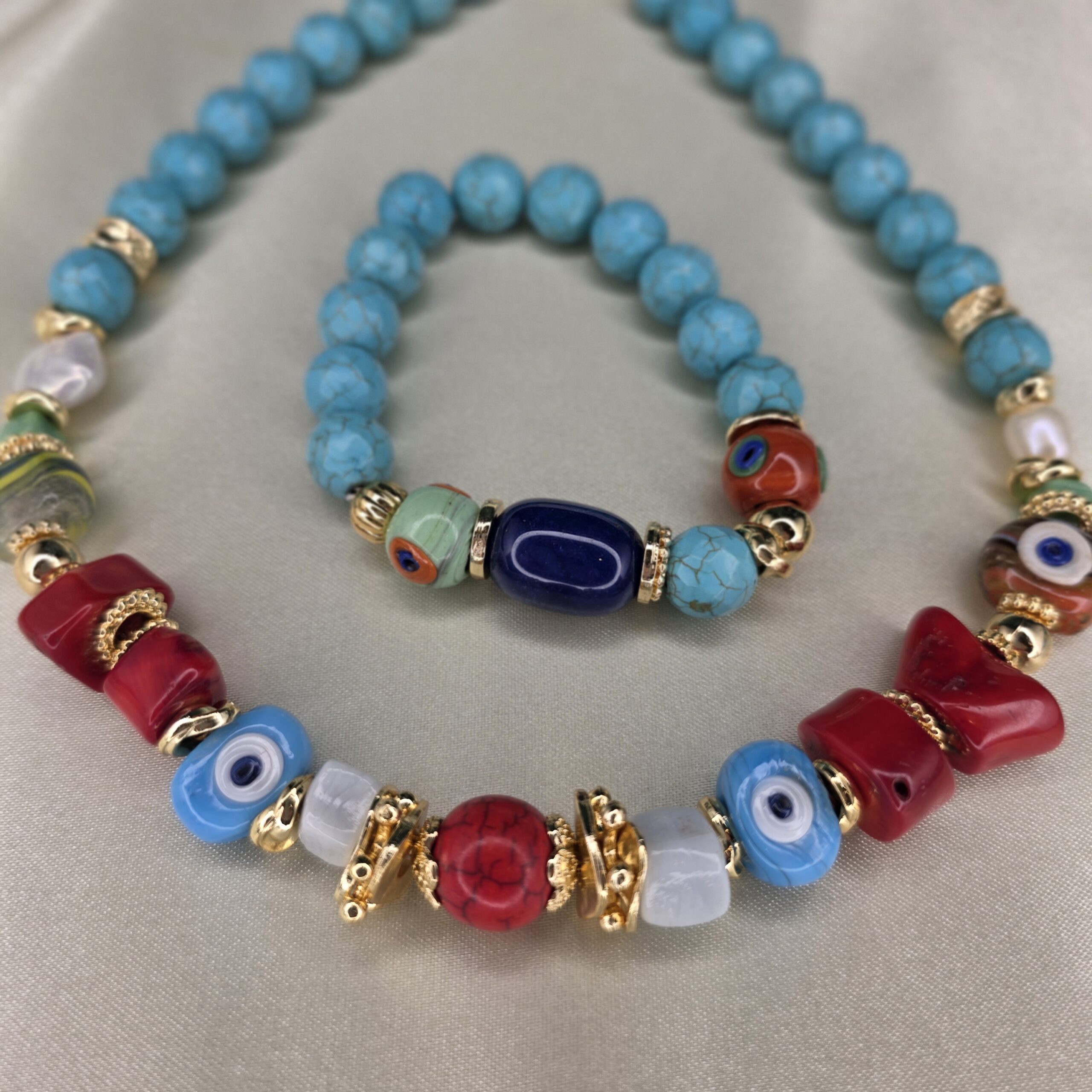 Doğanın gücünü stilinizle buluşturun! Turkuaz ve nazar boncuğundan özenle tasarlanmış bu eşsiz takı seti kolye ve bileklikten oluşur.