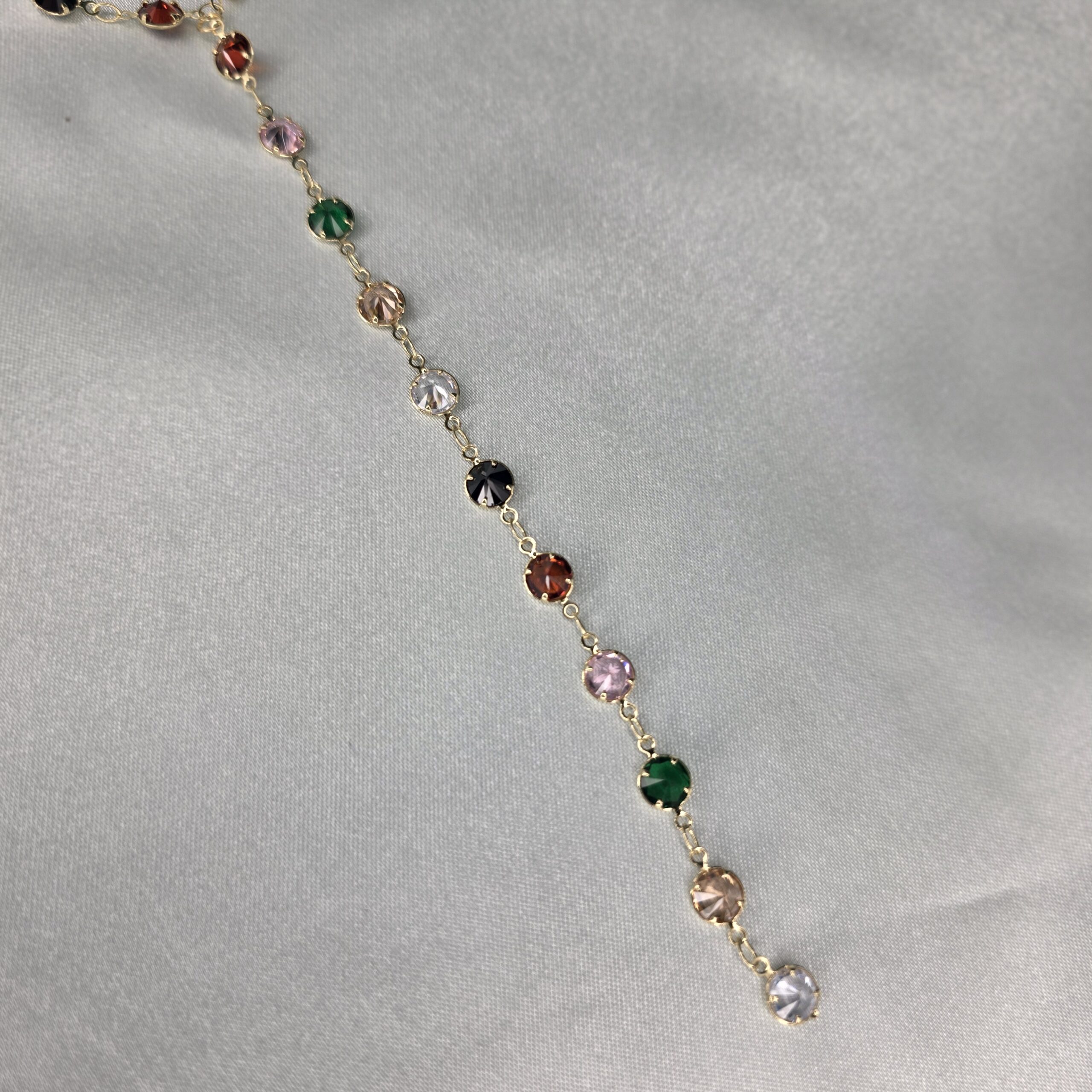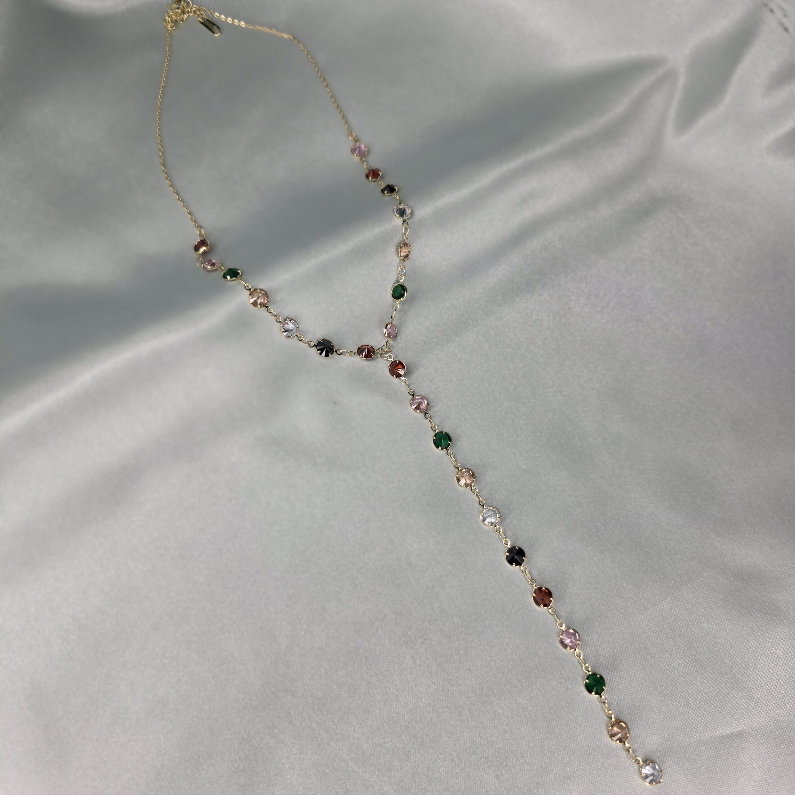 Zarif zincir üzerine tek tek işlenmiş renkli kristal boncuklarla tasarlanan bu kolye, günlük kombinlerinize canlılık ve ışıltı katar.